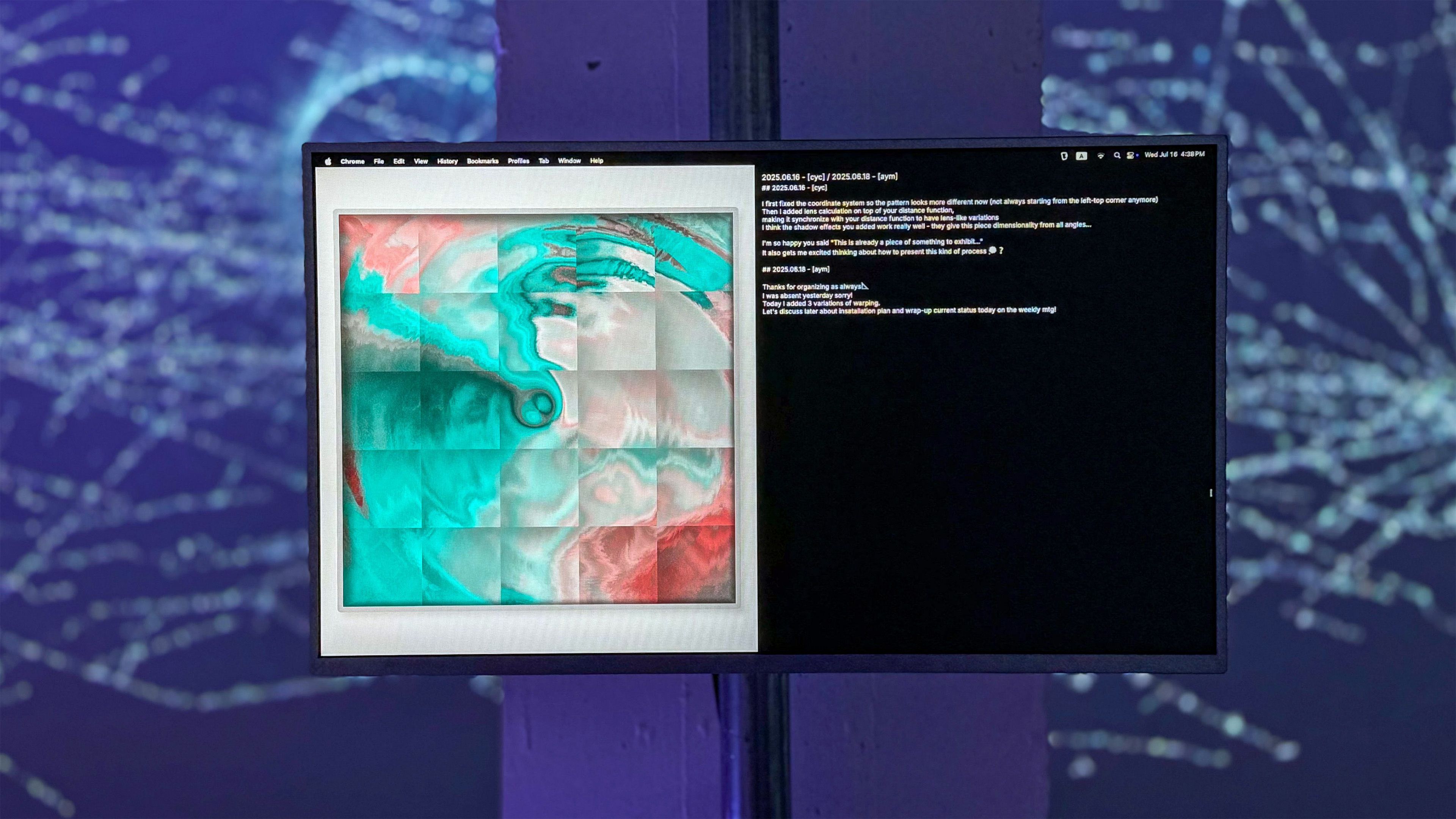 View artworkdialog() 2025 generates artwork through daily dialogue via code. Daily conversation traces are visualized, making the creative process the artwork. By updating a single Shader code like a shared diary, we record the evolving trajectory.